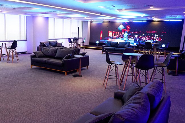 Lounge mobiliado com sofás e bistrôs.